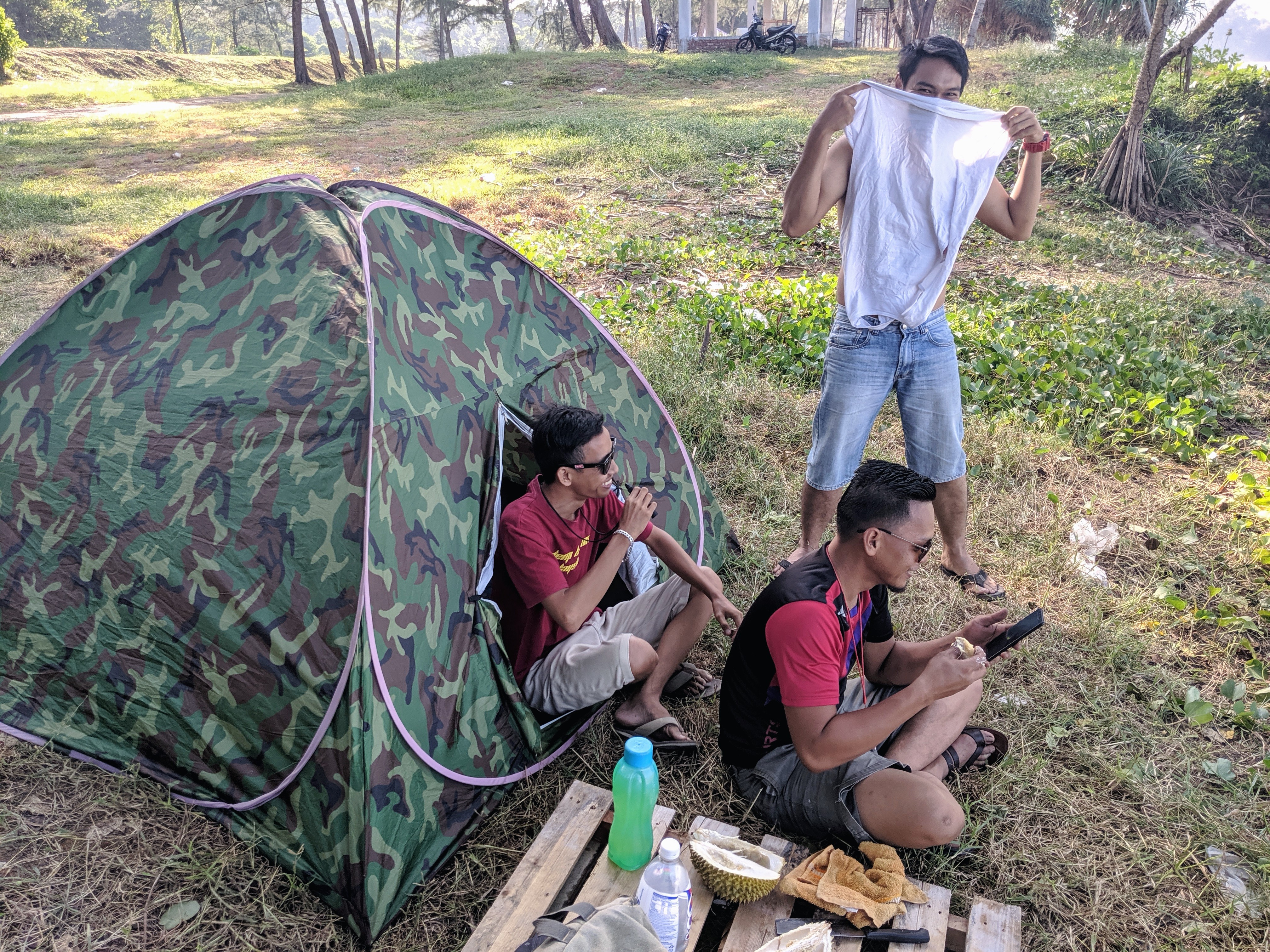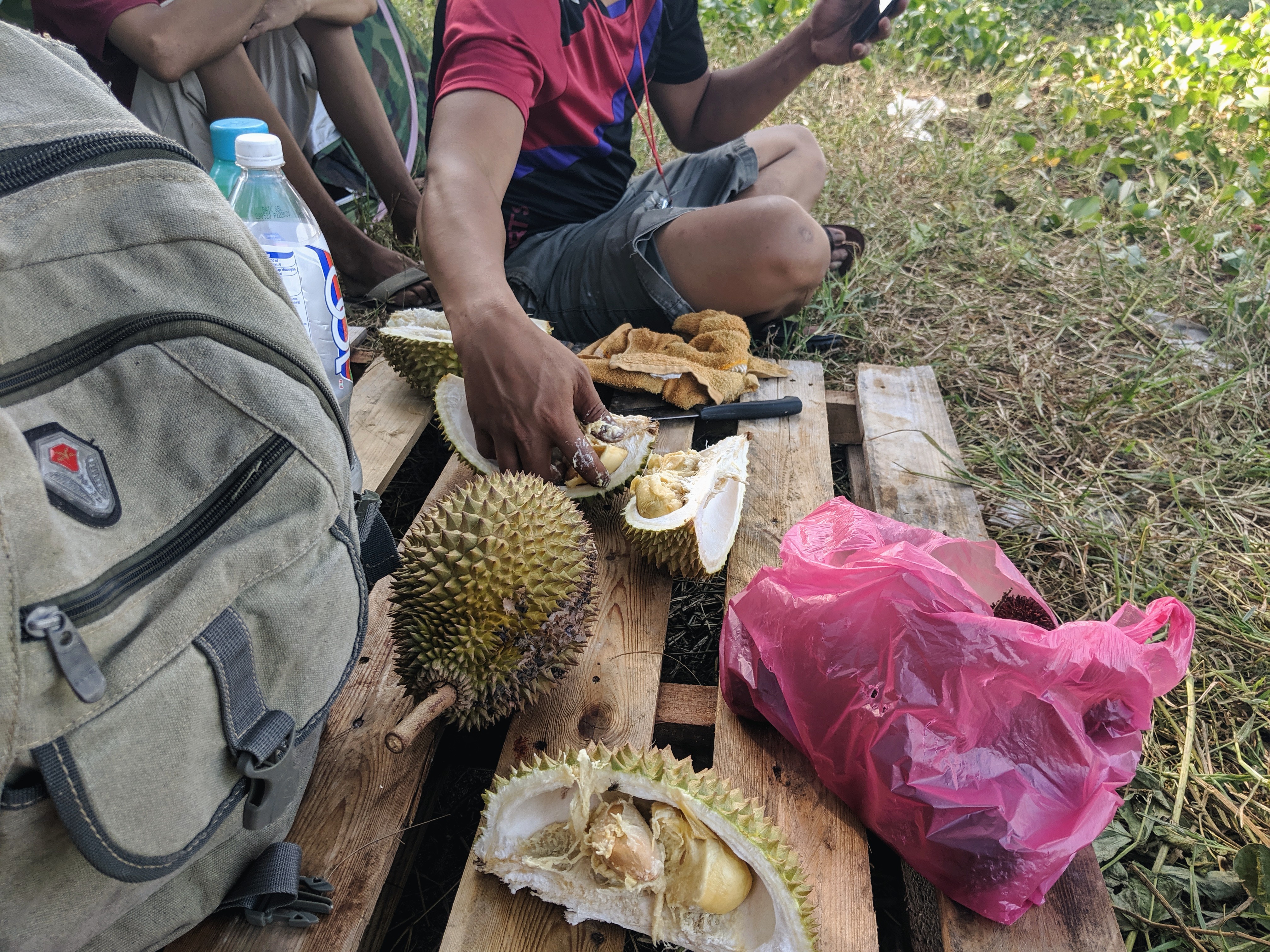 After 20 miles or so I reached a beach and was waved over by a bunch of friends to share some durian and rambutan – a huge gesture, this the ‘king of fruits’, and also big pressure on me given its divisive nature!