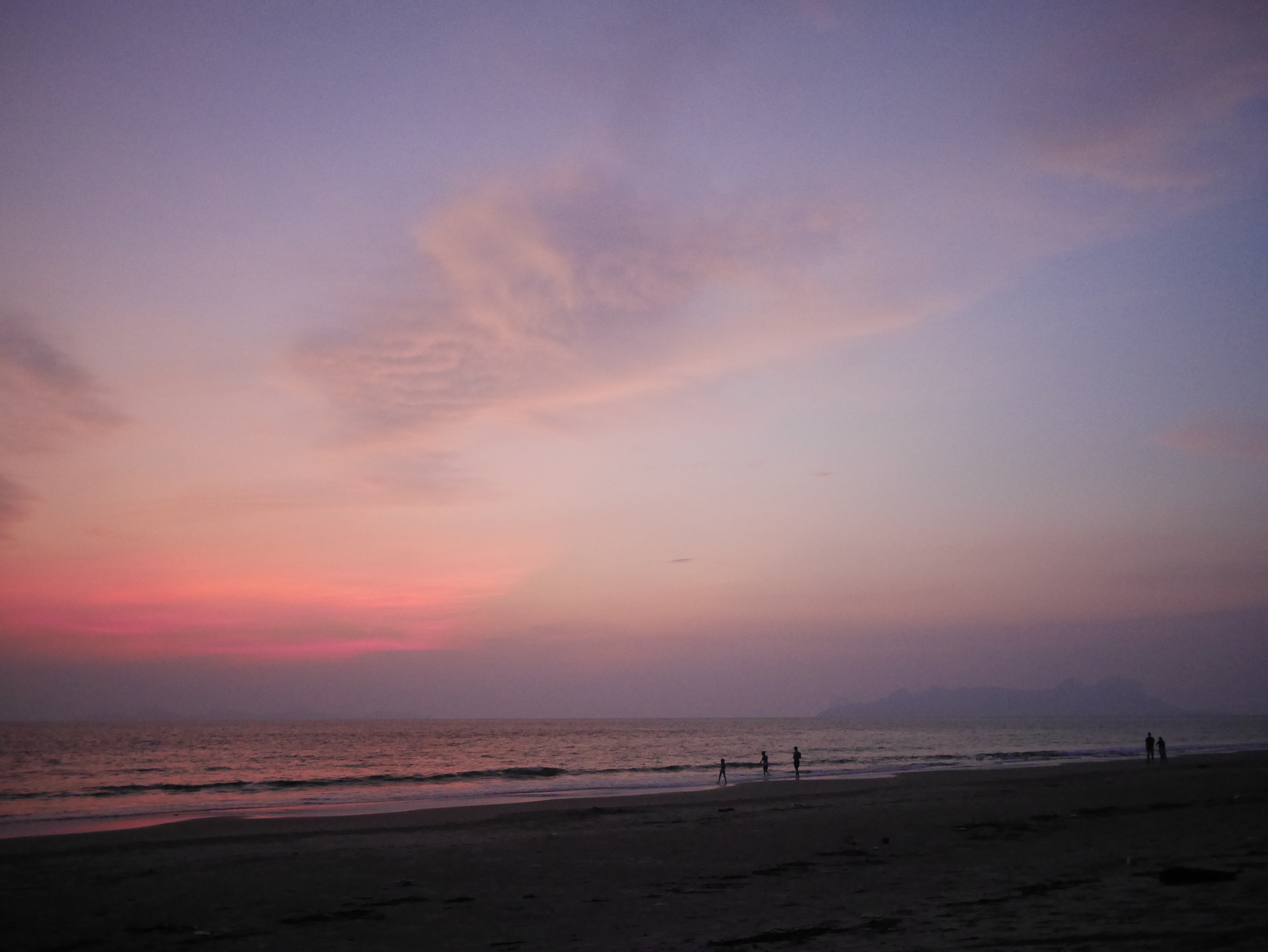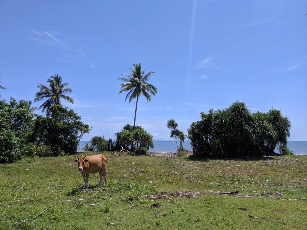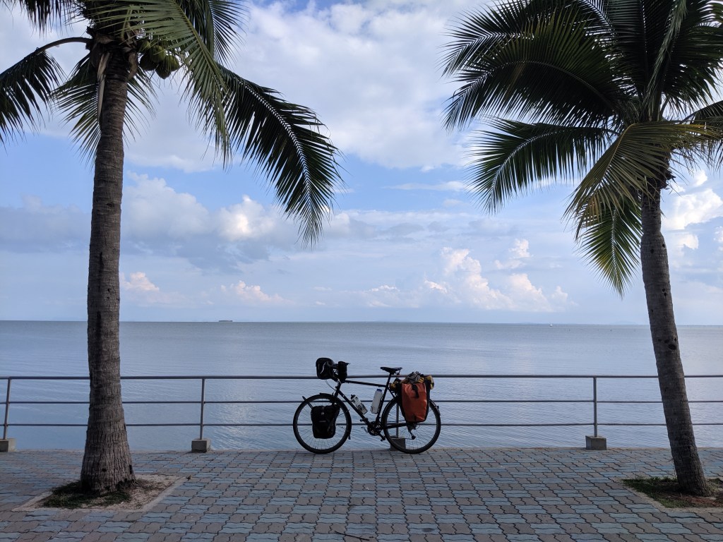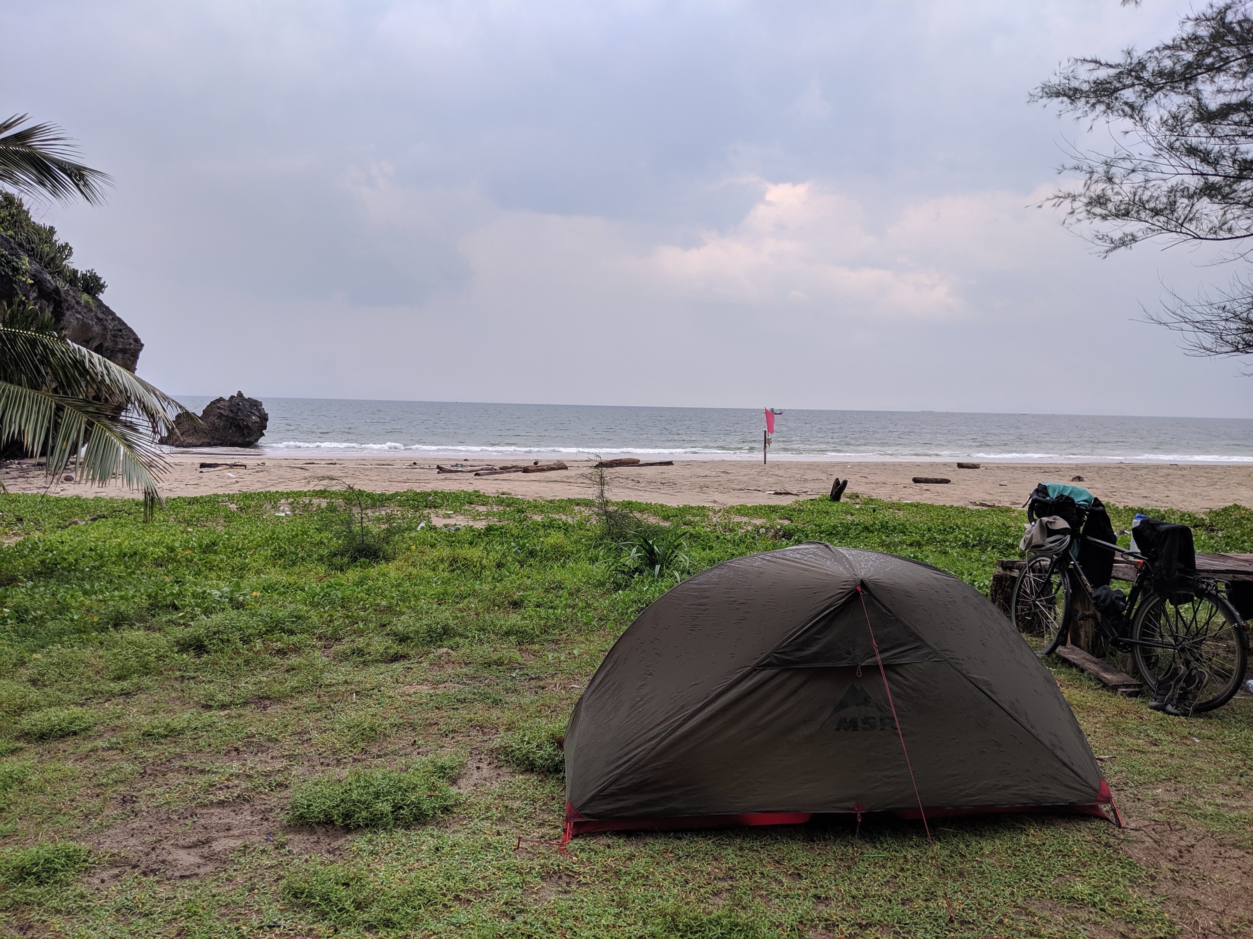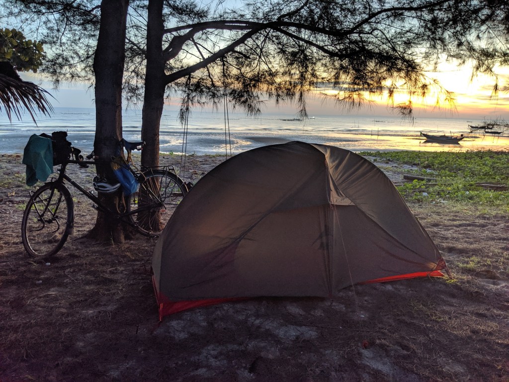 Seizing the moment I set off south (the total wrong direction), riding through more pines and mangroves to a quieter beach some 25km down the road. There was a small hotel and a restaurant and I asked if I could camp. “It’s too dark over there in the trees” the hotel owner said, “camp right here and you can use my lights!”. He didn’t ask for any money but I ate in his restaurant and gave a 100% tip. In return he set me up with a firepit and some coconut husks to burn as I watched the fireflies and green glow of the squid boats fishing with lights out on the horizon.