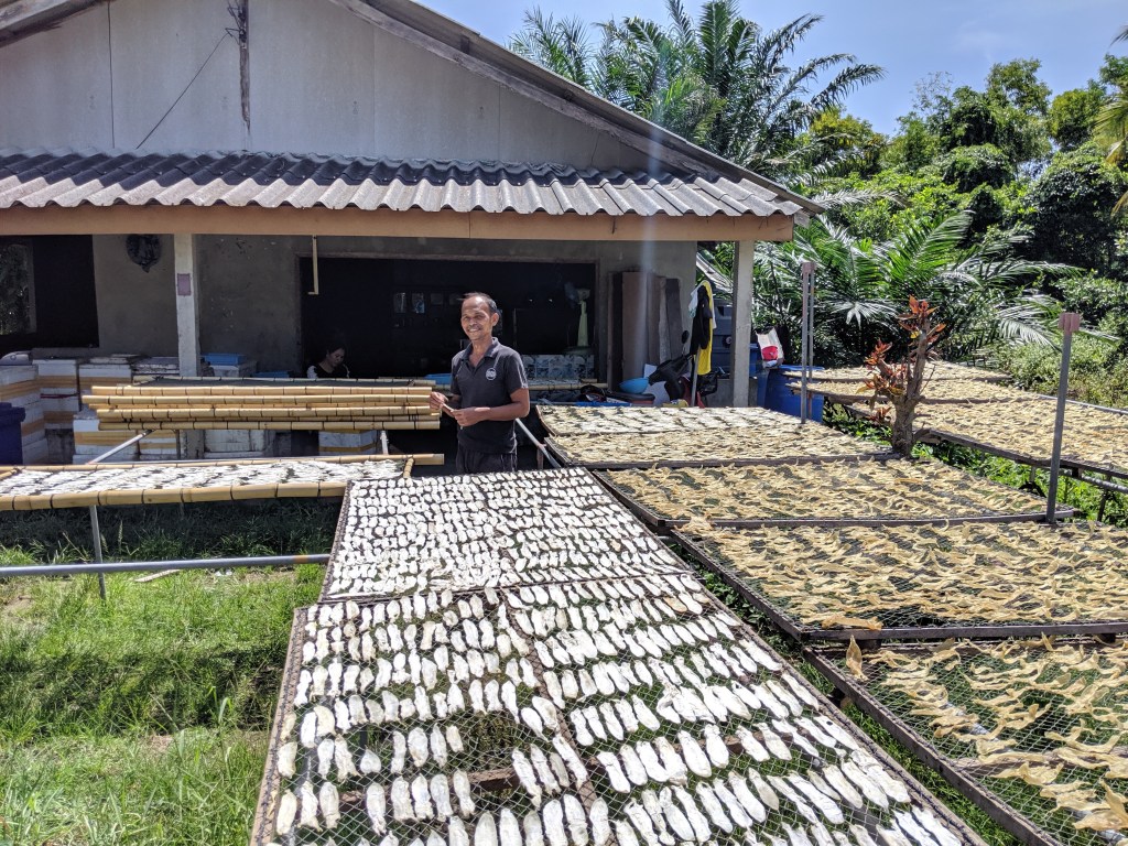 The road turned out to be the best in Thailand to date. Shady rubber plantations, basket weaving, rice cakes drying and fisherman out setting nets by hand, it was a lovely ride. I reached a jetty and asked about the ferry. An old man enthusiastically flailed his arms, almost knocking his noodles over. I took this as an affirmative, but was really none the wiser. More pointing and waving. Luckily, a kind lady, busy preparing a basket of crabs with her mum, helped me interpret the hand signals. I needed to raise a flag to hail a boat from the other side. What a fabulous system!