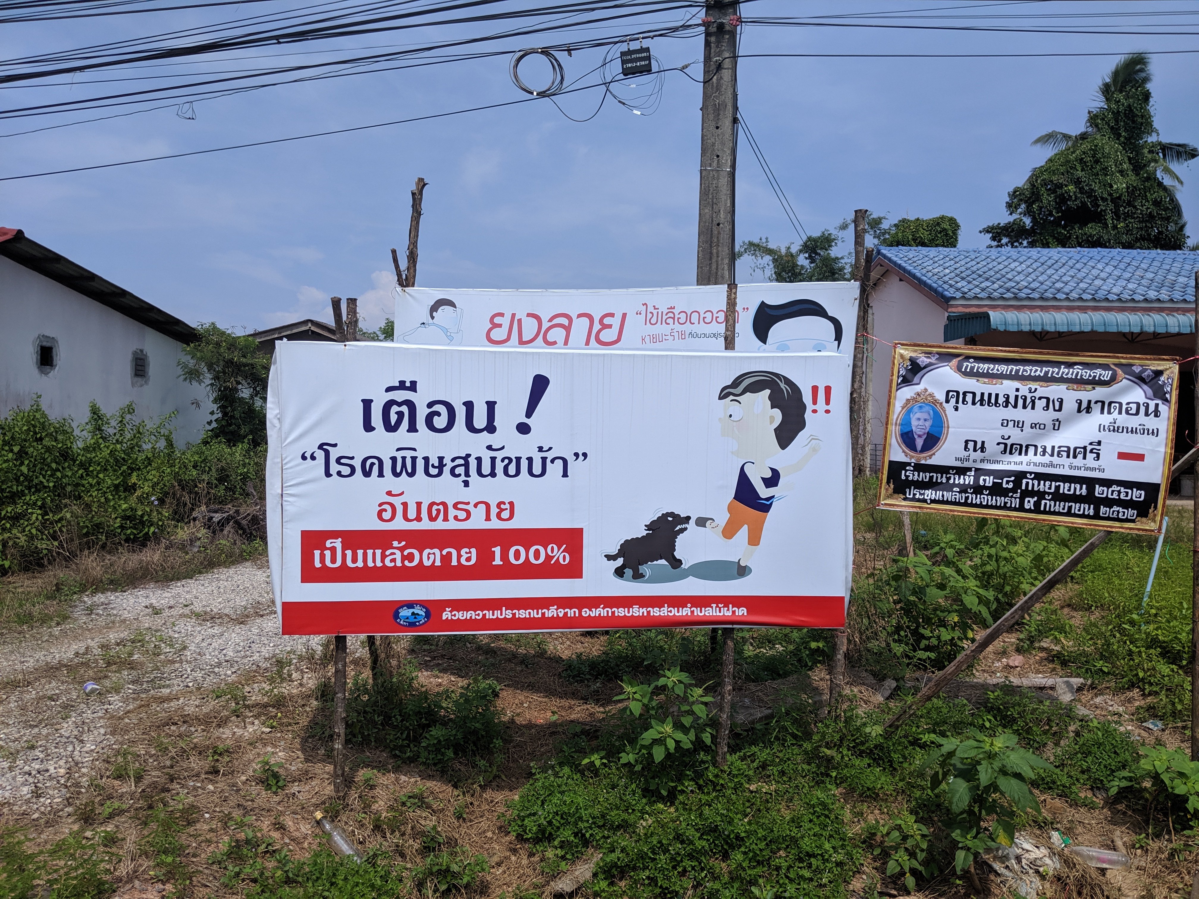 Despite the royal treatment for some, an awful lot of the dogs in Thailand are in a real sorry state and survive by eating what they can from piles of old rice left out for them or by rooting around in scraps by the side of the road. Perhaps a quarter of the ones I saw had problems with their legs, but that still left 75% fit enough to give me a very good chase! And in my first couple of weeks, chase they did. At first I was worried about being bitten (‘Rabies kills 100% of the time’ – reads the poster below), but my manic escapes (at full speed, with little regard for anything other my assailants) were actually much more hazardous.