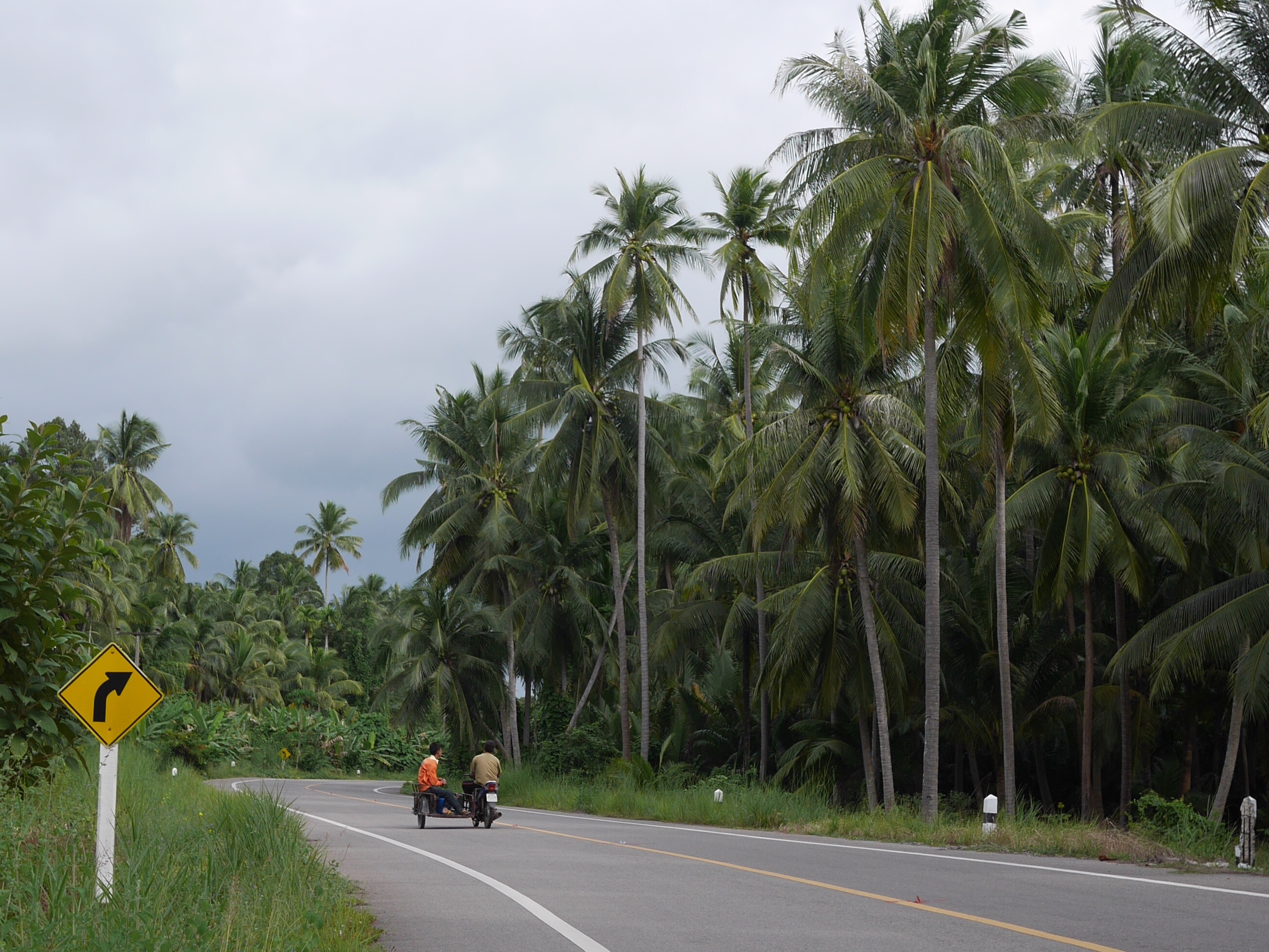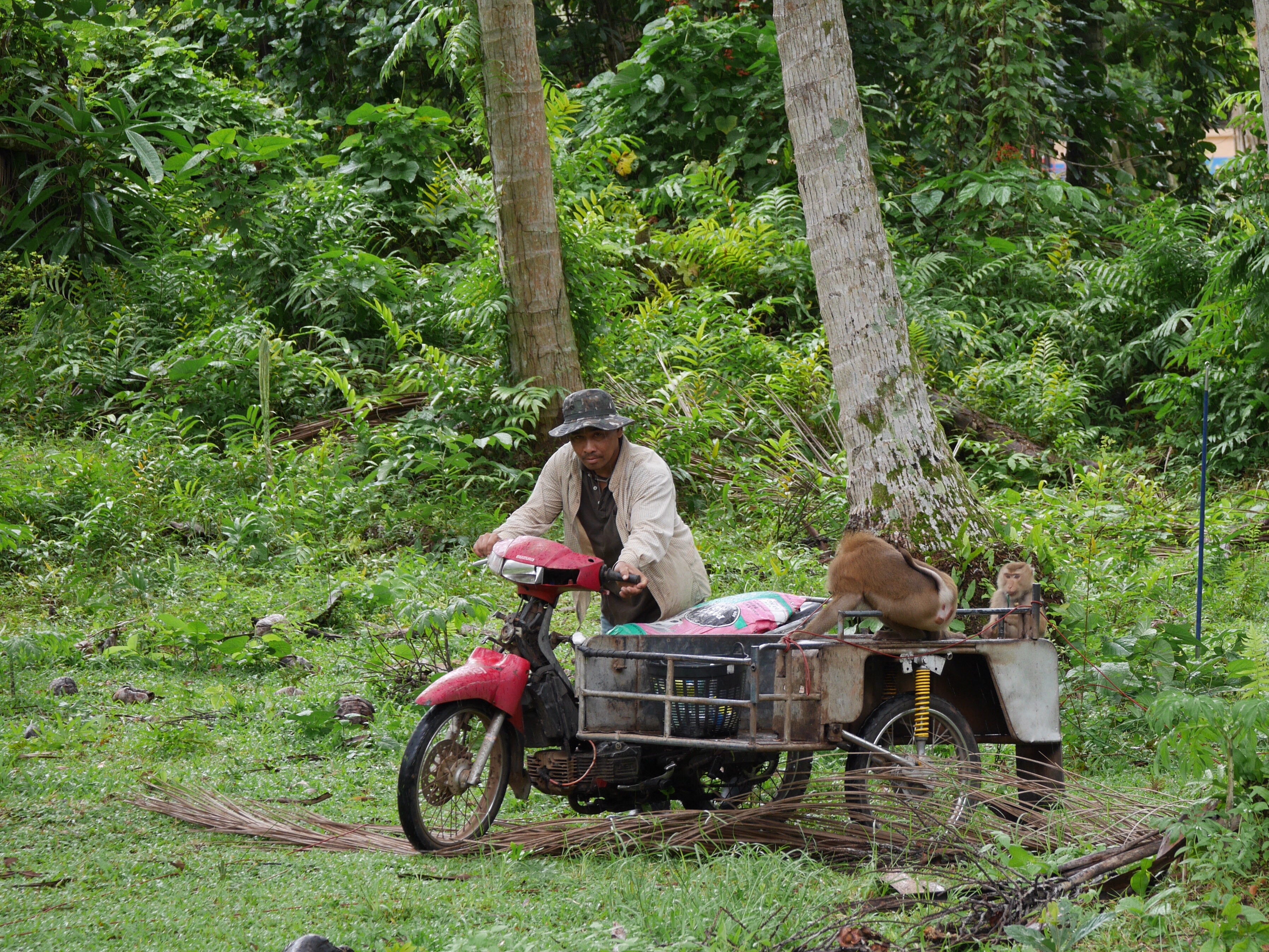 I plodded on through quiet roads but had to double take when I was overtaken by a pair of monkeys, casually reclining in a motorbike sidecar. They were monkeys on a mission, out harvesting coconuts, and I later caught up and stopped to watch them work. They were incredibly efficient, and guided by their handler, can apparently pick around 80 per day. These monkeys became a common, if surreal, sight, lounging in the backs of pick ups or even sitting in the driver’s lap, gripping the motorbike handlebars like a child.