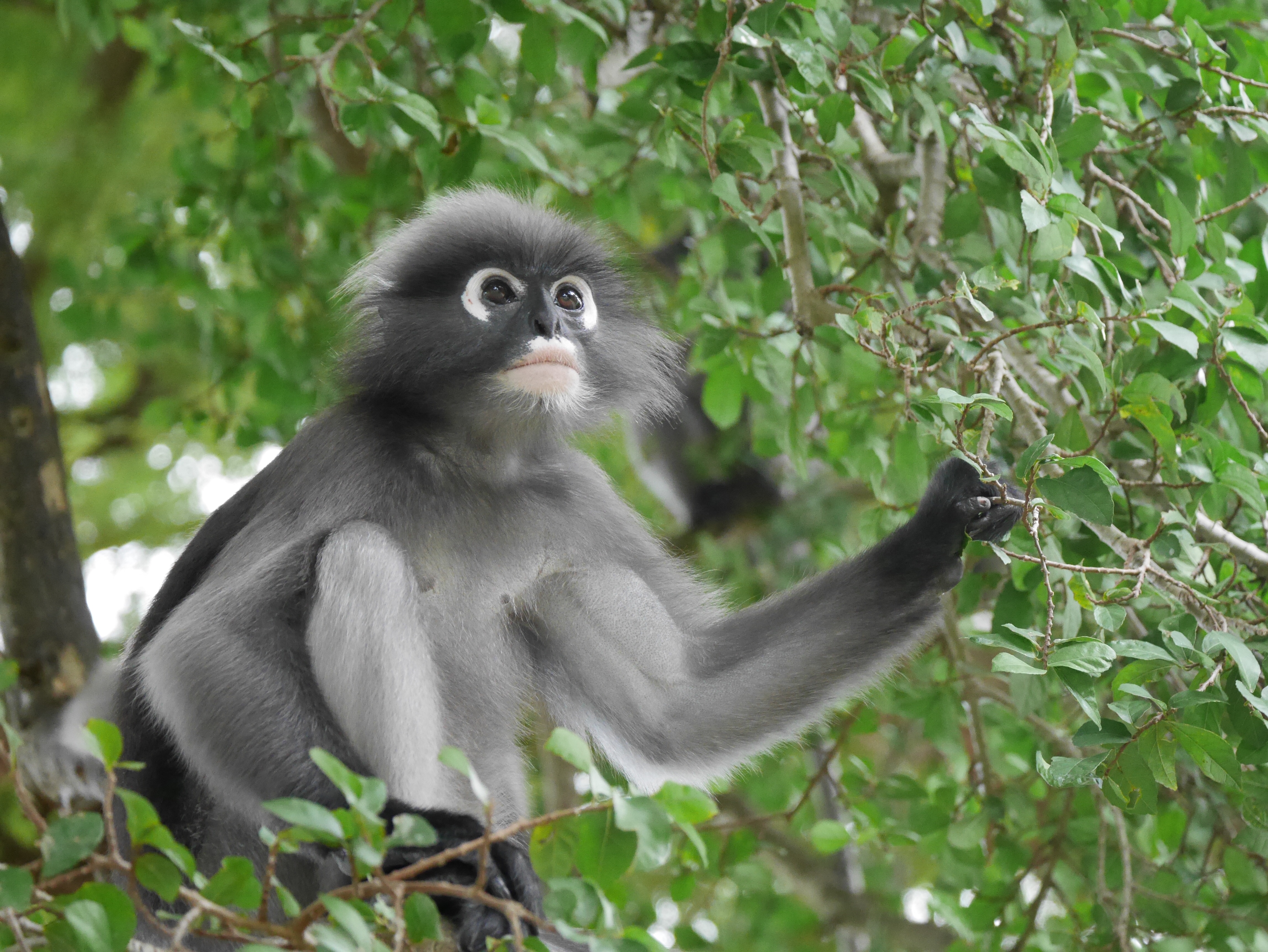 Unlike macaques, which can be aggressive and cranky, dusky leaf monkeys are incredibly gentle. Although nominally wild, these ones were very relaxed around people and not fussed about me approaching. A man with an automatic weapon watched from a distance as I took some photos. I suppose there aren’t that many monkeys that have their own armed guards!