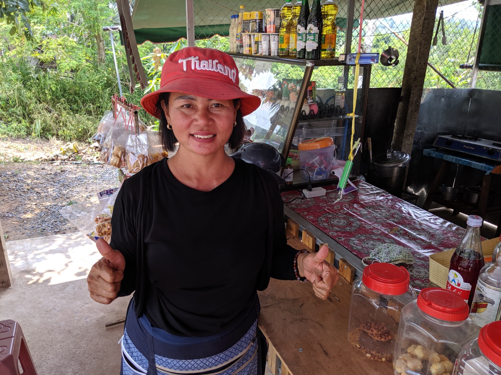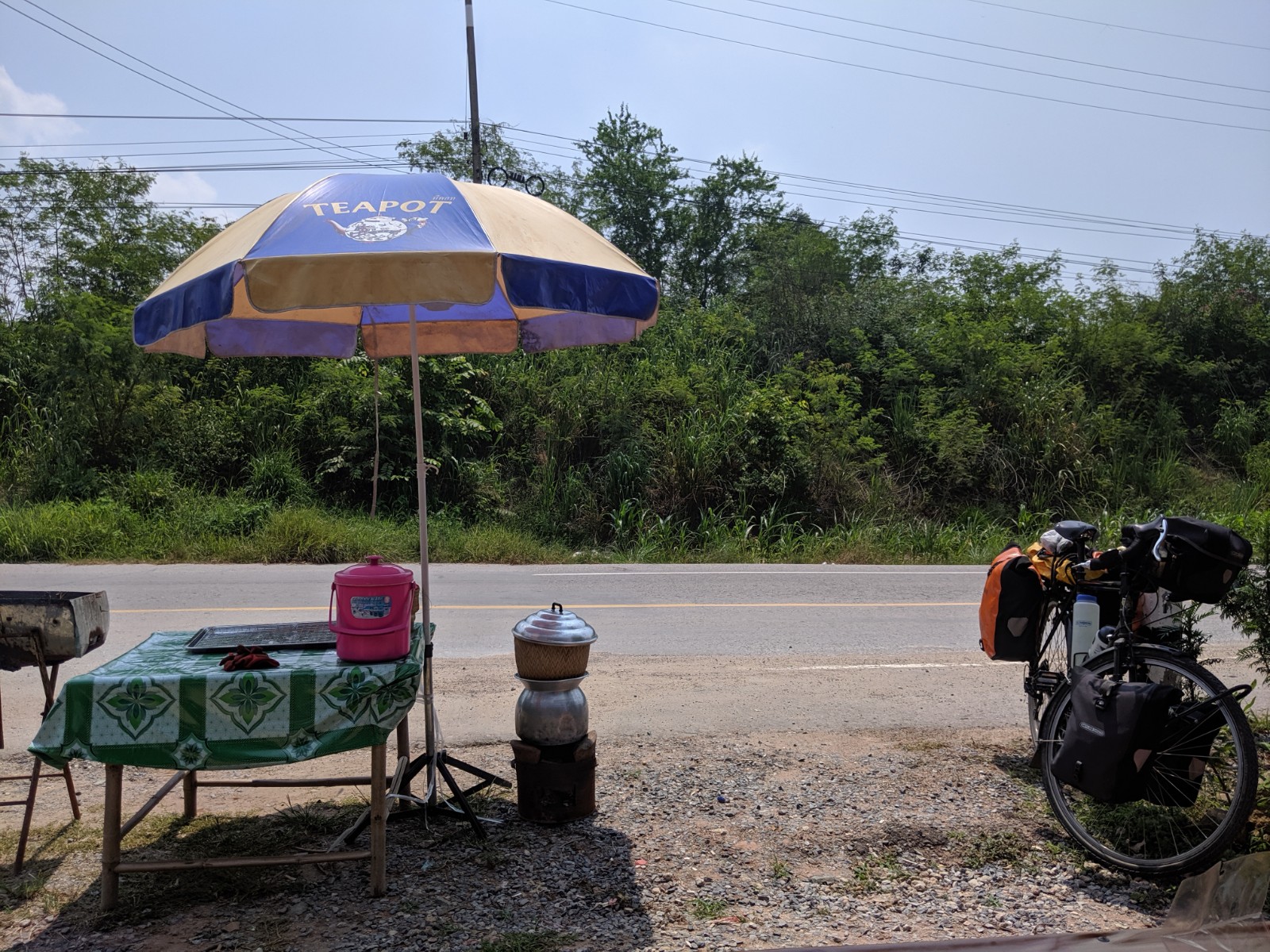 After a while I was flagged down by a super nice lady at one such place, grilling some meat and steaming some sticky rice in the middle of nowhere. She spoke quite a bit of English, explaining that a British guy (also a cyclist) drops in every Thursday to teach her.