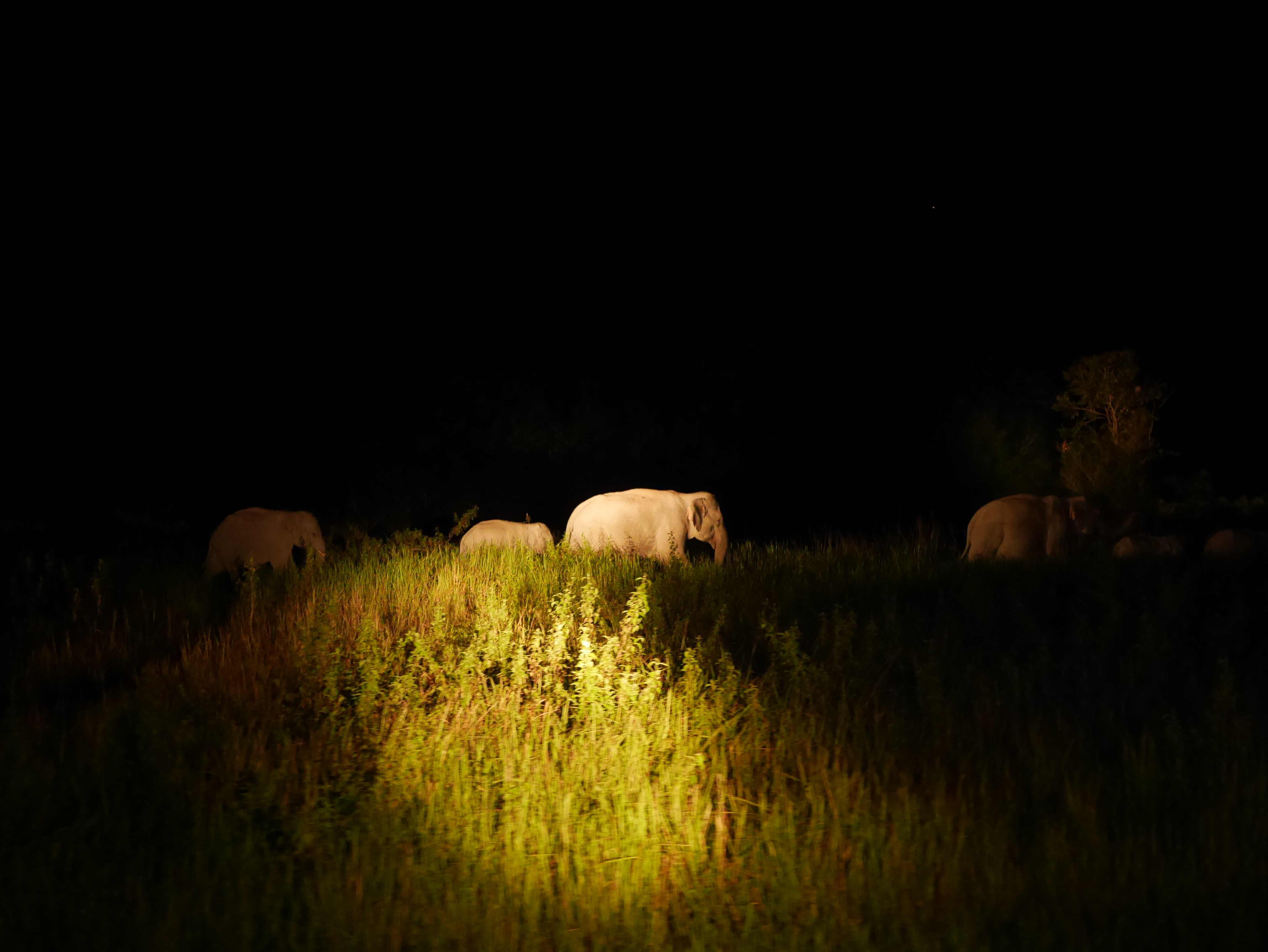 We would have been happy with the stars and novelty of a cool evening breeze, but there was soon some action as the guide picked out civet cats, hunting dogs and various types of deer on their evening manoeuvres. This was just the warm up though. A flash of grey in a small clearing soon transpired to be a herd of around 15 wild elephants on the move. I felt bad for disturbing them and expected them to disappear in fear of the light and motor. They seemed totally non-plussed though and carried on without any hurry. Now I was glad to be off the bike!