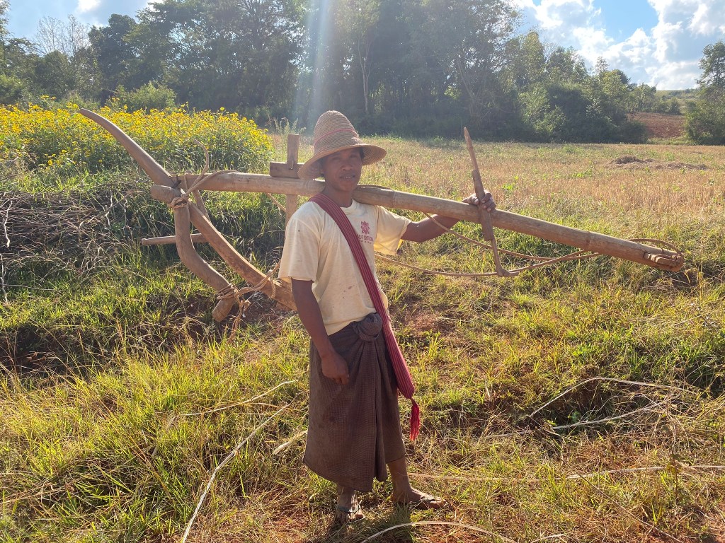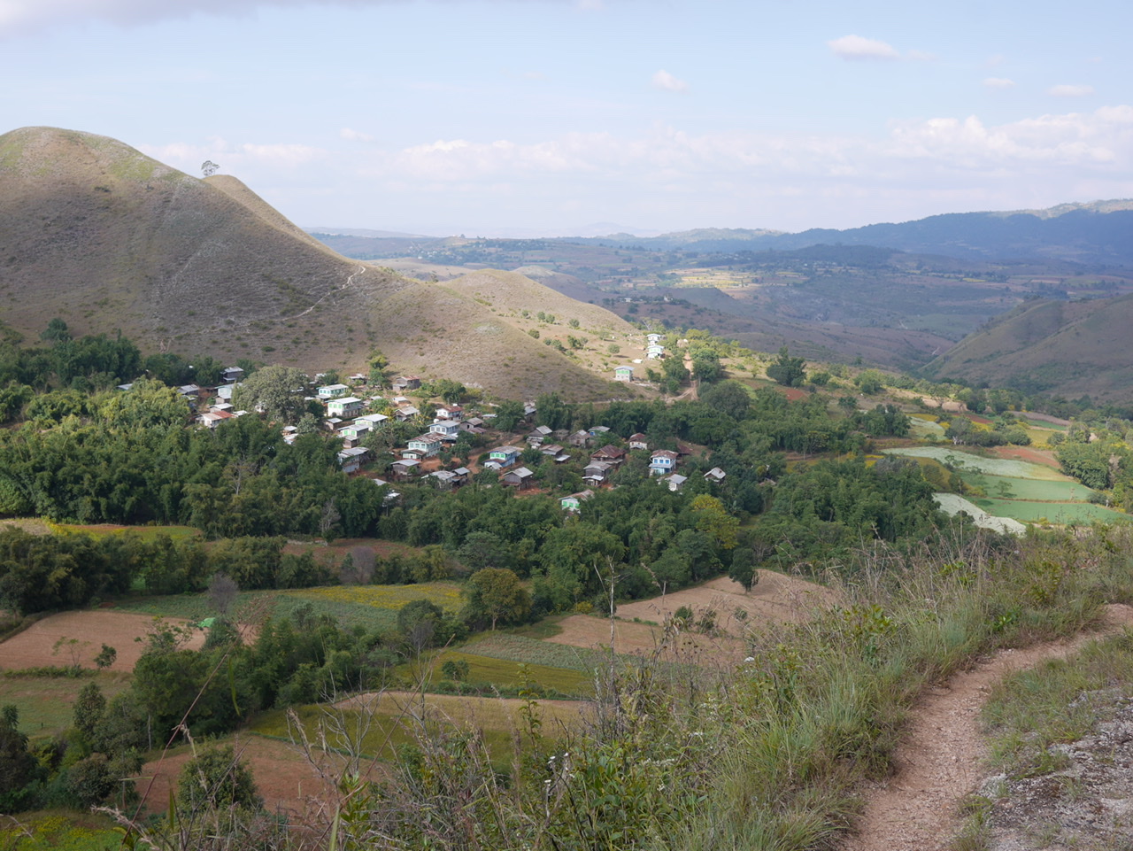 We began up in the pines around Kalaw which soon gave way to rice fields and grazing land for buffalo. We were most blown away though by the market gardens. Tomatoes, cabbages, chillies, pumpkins, melons all in great abundance, everything totally unmechanised. Superficially it was an idyllic scene: wooden ploughs, straw hats in the sun and water carried on shoulder poles. Behind the smiles though lie hours of unrelenting and repetitive hard manual labour and exposure, which must take their toll. Ye Lay told us that until recently the villagers had to carry their produce 10 miles over the hills by night to reach the weekly market in Kalaw. A hard life.