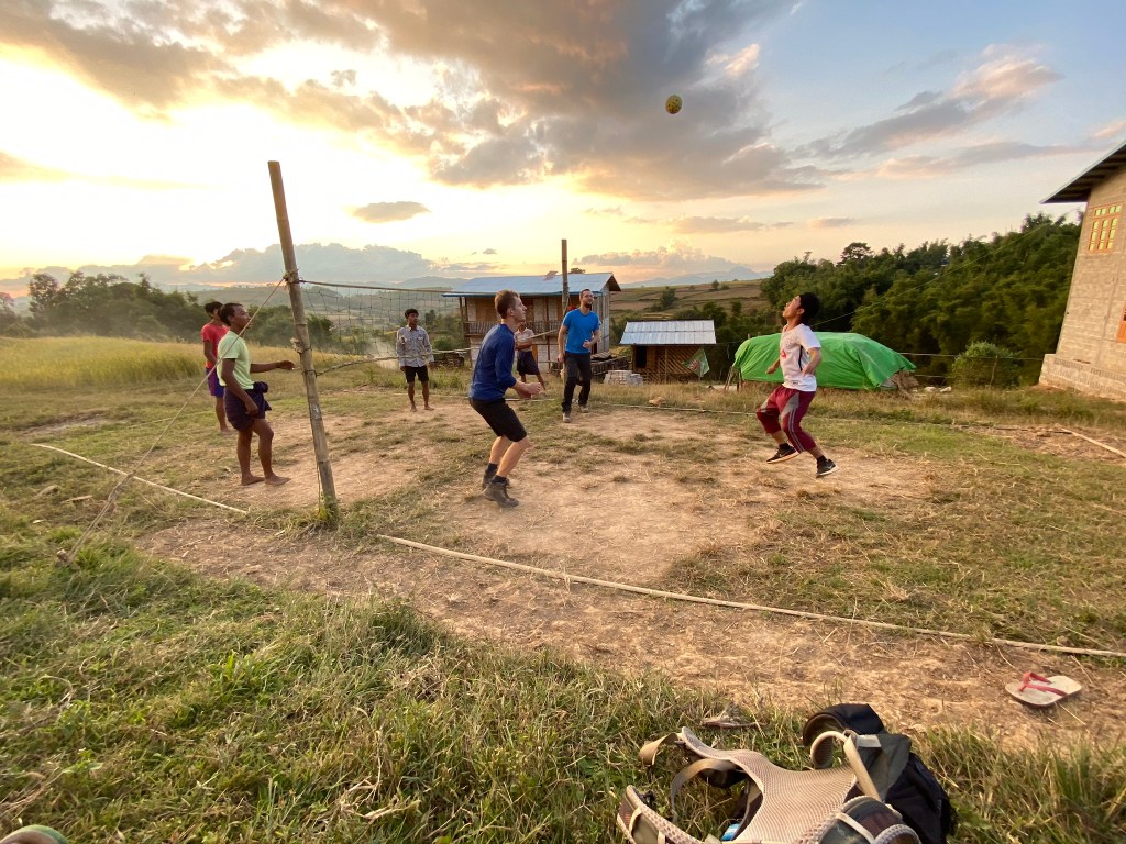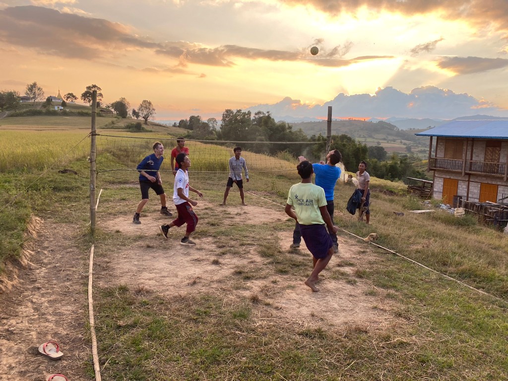 As the day was drawing to a close, we joined a small crowd to watch. Ye Lay said it was a whole village activity with everyone gathering round each night after work. The guys were superhuman, playing in rolled up longyis and somehow performing ‘spike’ shots with their feet. Immense respect!