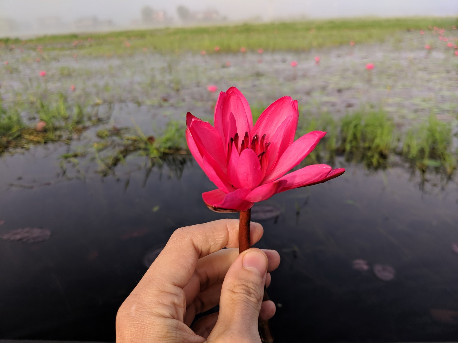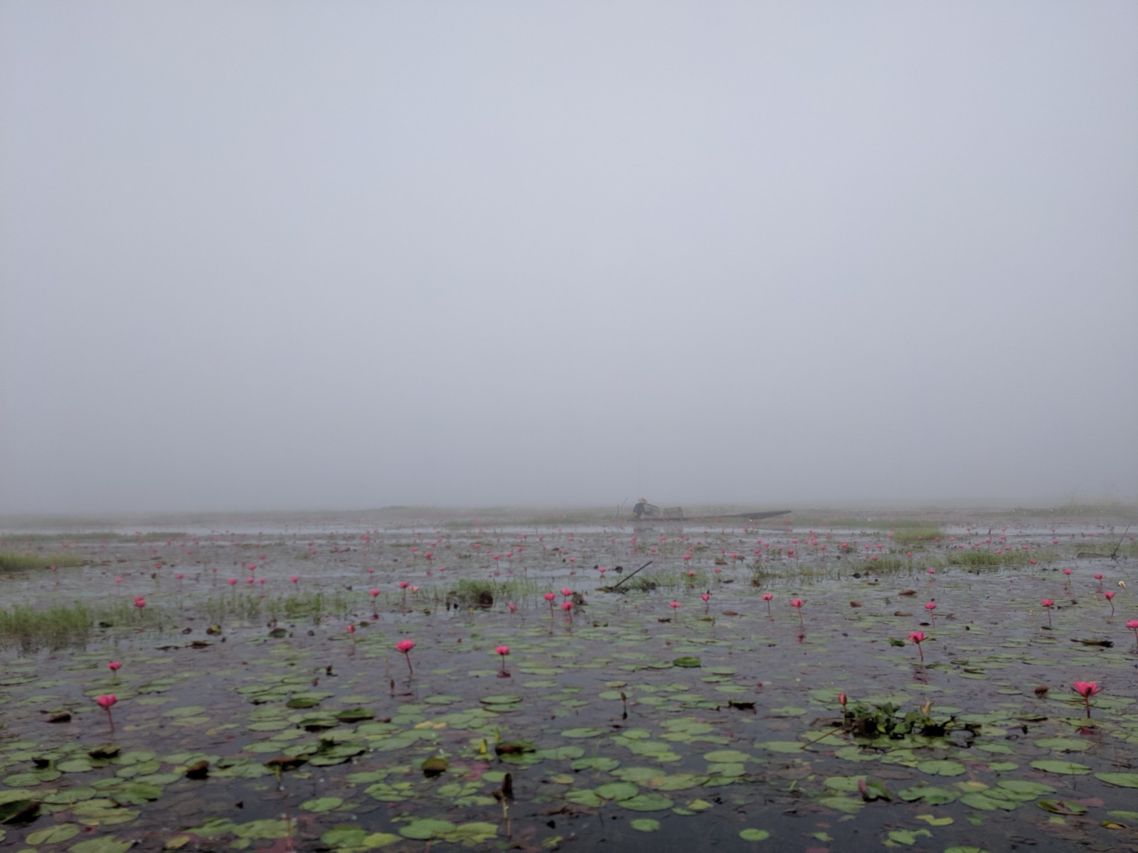 We disappeared in and out of the mist, passing houses on stilts, floating tea shops, island temples and fields of bright pink lotus flowers.