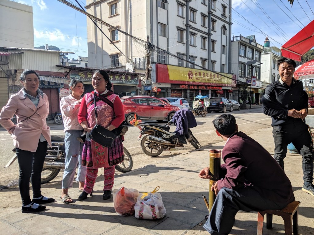 Stopping for some noodles, I noticed this group in traditional dress. They looked to be H’mong (known as Miao in China) – the most significant minority over the border in Ha Giang. The man in the bottom picture is using a water pipe – also very common in Vietnam.