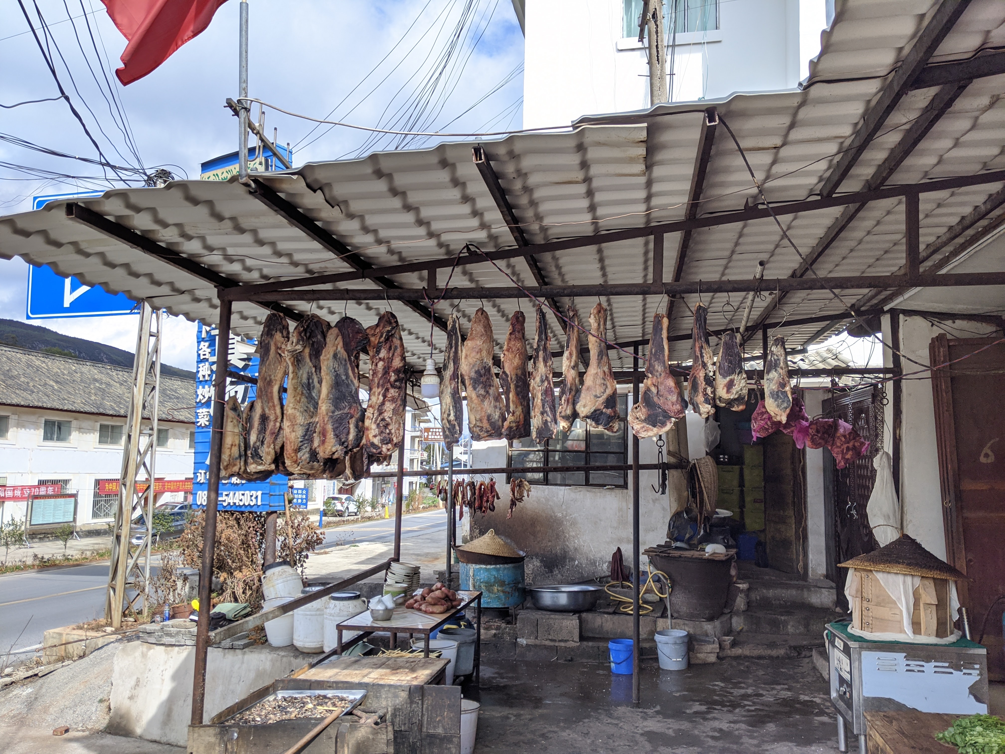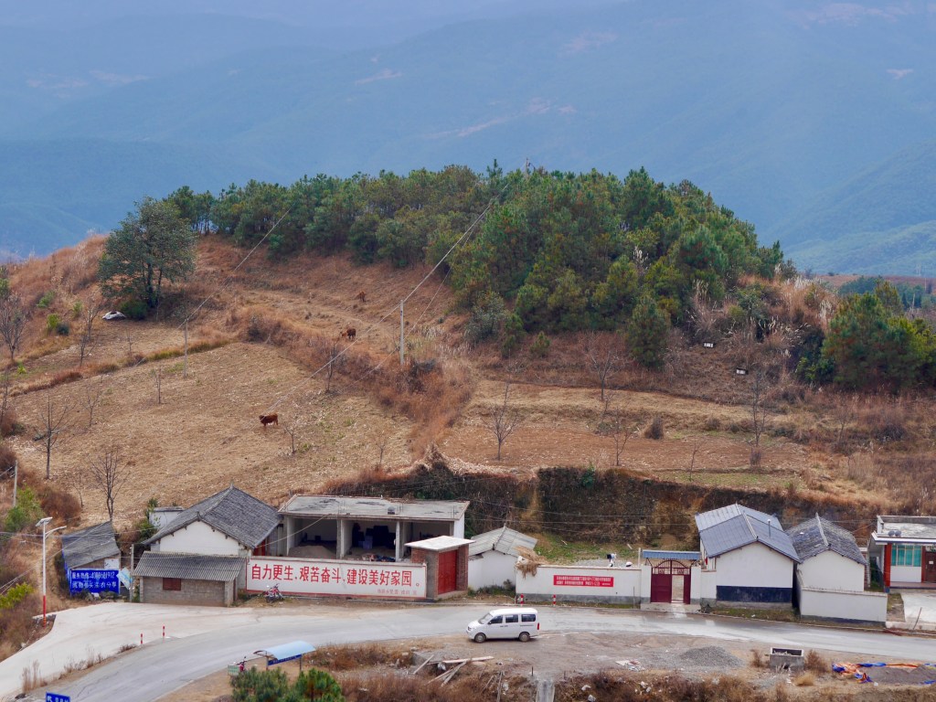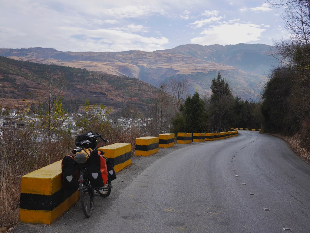 I hung around for ages in this particular shop, trying to warm up, then called in at the petrol station next door before tackling one final climb over the ridge toward Lijiang. Petrol stations had always been my friend, but you couldn’t guarantee what you’d find in terms of bathroom facilities. This was a quiet road, so privacy wasn’t an issue, but you wouldn’t want to be caught out here with a crowd.