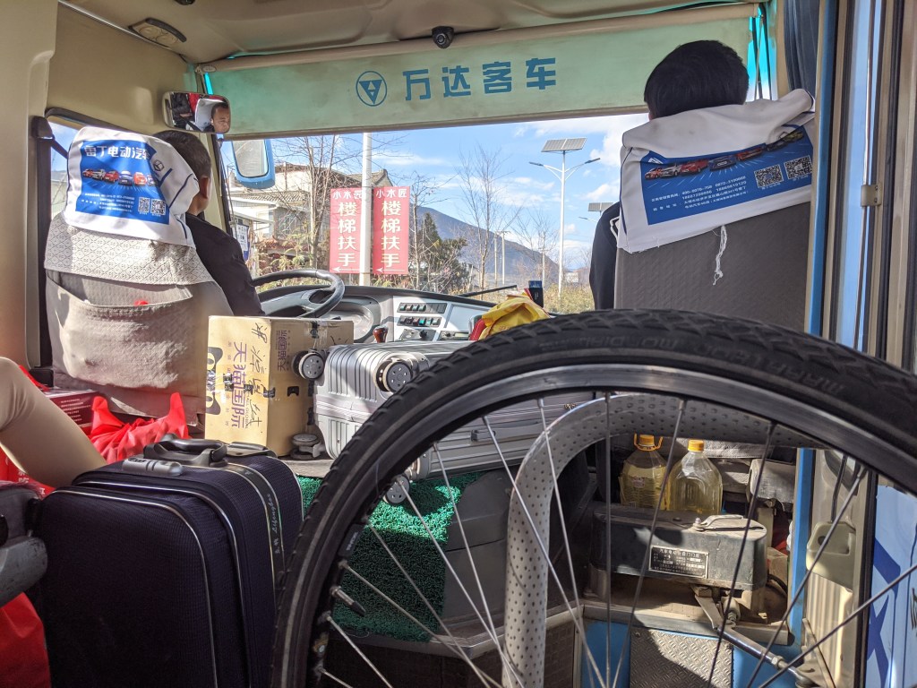 I really couldn’t ride anywhere now (not in a straight line) so rather embarrassingly I ended up taking the wheel on the bus (!) 70km down the road back to Dali in search of some expertise.