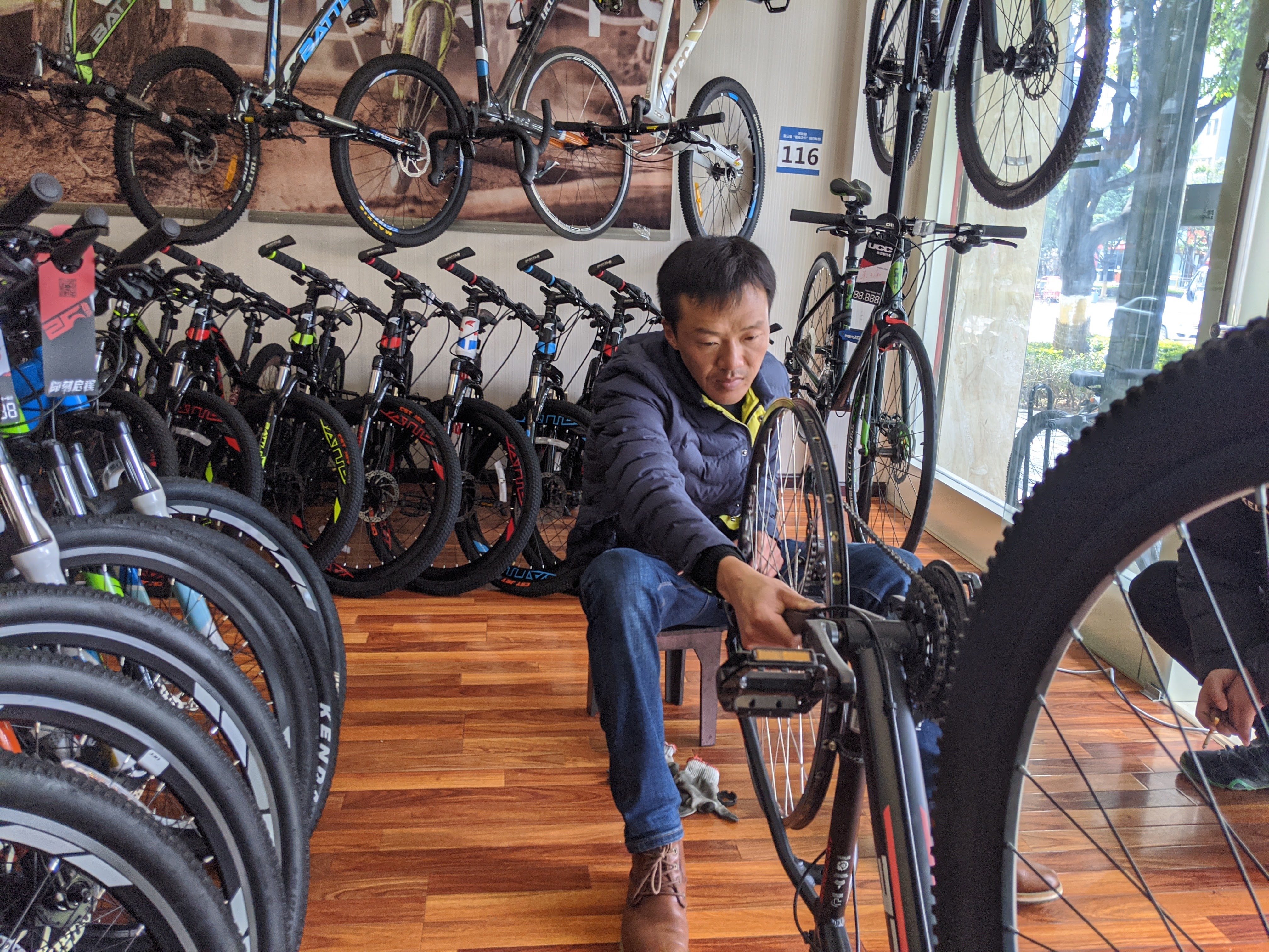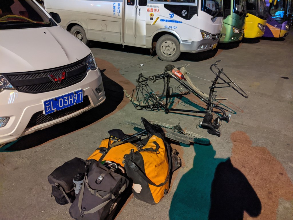 This was an adventure of its own – requiring me to bargain with a variety of stern-faced drivers in Mandarin before I found one willing to accept my cargo. After hours of waiting, I crammed the bike in in such a rush that I lost a bunch of screws and had to scrabble around this depot in the dark for a good half hour on arrival. Good start!