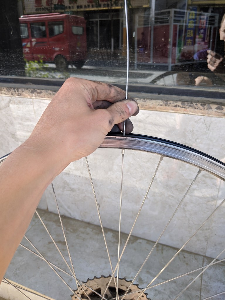Never mind – what the cycle shops lacked in confidence, the passing local Joes made up for in spades. None looked to have any cycle specific experience but each was happy to roll up their sleeves and torture my wheel into a kadeidescope of shapes, before shrugging and walking off, one at a time. Thanks guys.